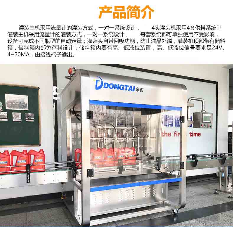 全自動潤滑油灌裝主機采用流量計的灌裝方式,一對一系統設計,4頭灌裝機采用4套供料系統單灌裝主機采用流量計的灌裝方式